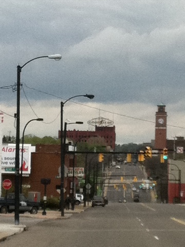 Below are some pics of us outside the high school (that’s Saint Joseph next to me in the first one) and in front of the students; a shot of the Goodyear building in Akron; and some photos of the flat Ohio countryside.