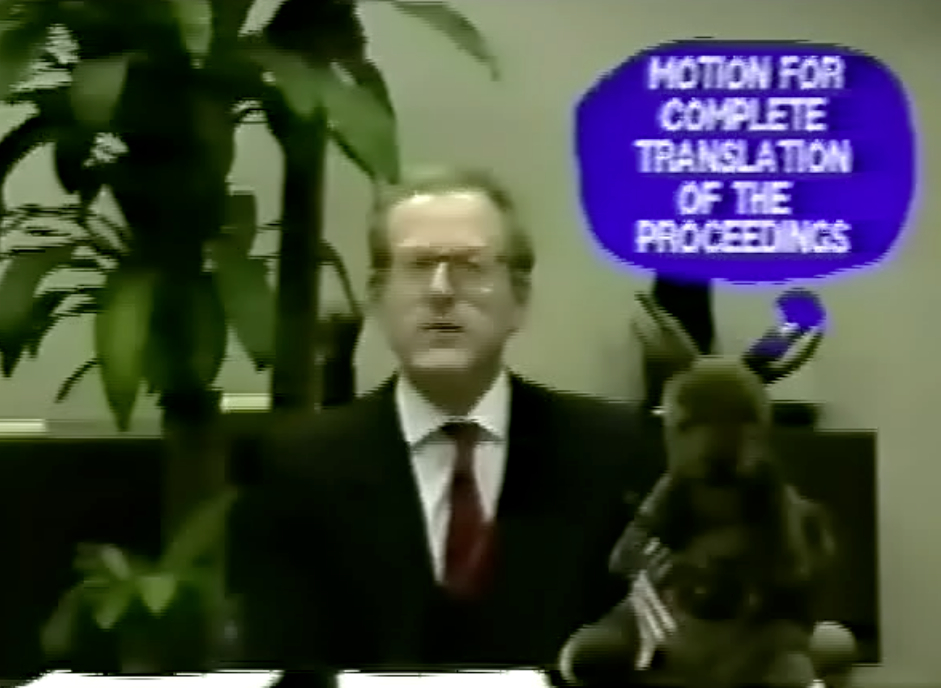 I’ve been in the U.S. since 1991, when I starred in a video for the Lawyers Committee for Human Rights (now called Human Rights First). My sidekick, Jeffrey Heller, had a guest appearance. Here’s a still from our video. I’m the one with a flag in the pouch, thinking legal thoughts.