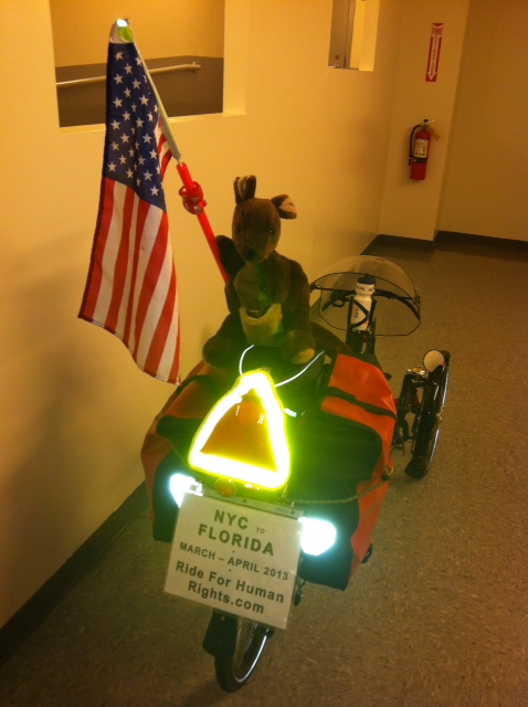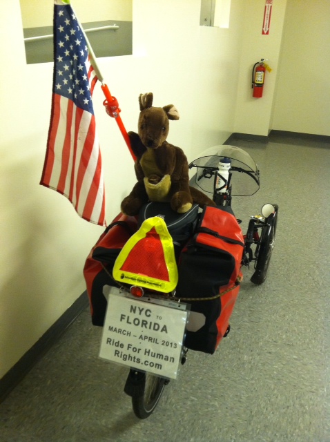 Road trikes are rare; drivers don’t know how closely they can pass, so they give trikes a wide berth. Some drivers may assume that a trike flying the Stars and Stripes is piloted by a disabled military veteran; civilian Jeffrey is not disabled, but when one shares the road with cars and trucks, one is grateful for even misdirected respect.