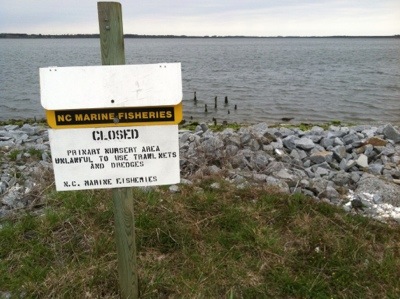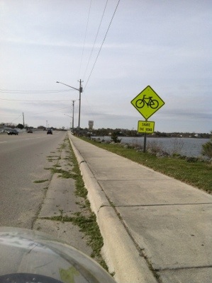 The overwhelming majority of drivers are courteous to us. This sign says we belong. But on NC 24, what passes for the shoulder is a line of low-set concrete slabs covered with debris. We couldn’t stay near the curb.