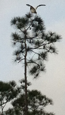 Outside Nahunta, we scared up a small white egret, and an enormous white bird of similar shape and dark gray head. The big bird flapped into a tall tree.