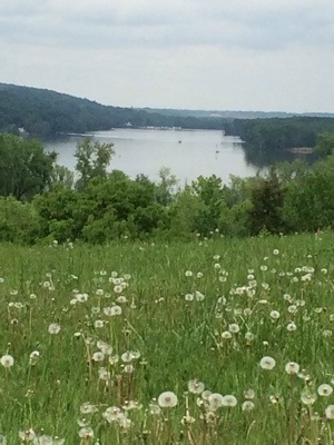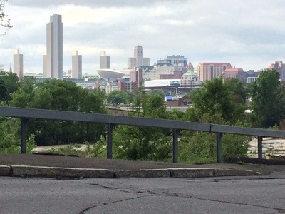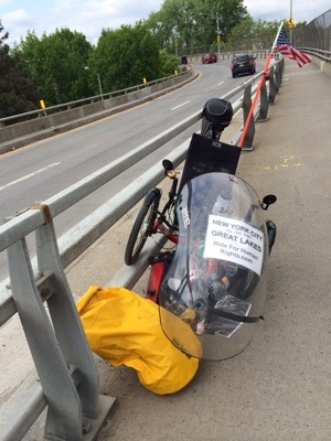 In late afternoon, we reached Albany, the state capital, nearly deserted at the start of the 3-day Memorial Day weekend. It was time to leave the Hudson River and turn West along the Mohawk. Jeffrey started over a bridge before realizing that he belonged on a bike path on the far side of a waist-high rail. He stopped – and stopped traffic! – while he removed baggage from the trike, put it over the rail, then lifted the trike over the rail and climbed over after it. Disaster averted!