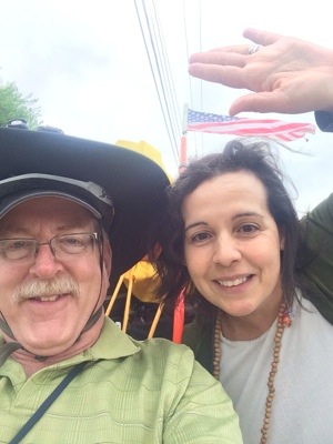 Meet Chloe. She called out to Jeffrey to ask about the trike. She ended up hearing about human rights and people who come to America to escape the bad guys. She put one of our stickers on her shirt, and let her mom, Pat, join her in this photo.