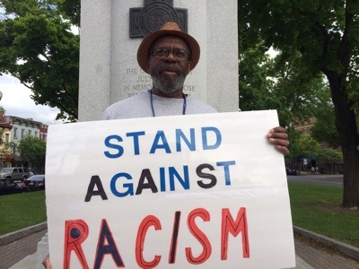 Archie stood by Albany’s Spanish-American War monument. He and Jeffrey talked about human rights campaigns. Archie said when he displays his sign, or a peace sign, most people are indifferent, quite a few are friendly, and a few get nasty. The nasty ones hurt, but they remind him of why it’s important to raise consciousness. Jeffrey admires Archie’s attitude.
