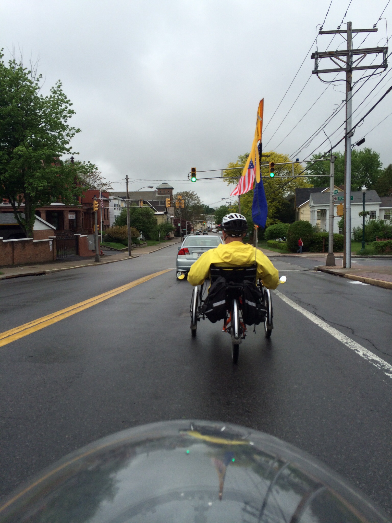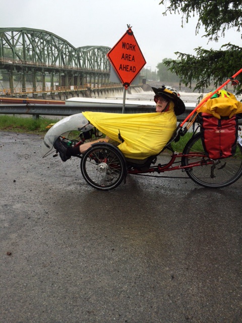At the 25 mile mark, the humans (including Leslie, who drove out to retrieve Ken) ate lunch at an ice cream and sandwich place.  The trikes and our Ride signs attracted attention.  Jeffrey explained to a family how asylum applicants are lost without lawyers, and how Human Rights First tries to provide them.  The mother said she will follow our progress on the Web.