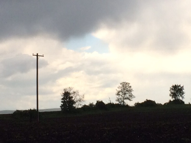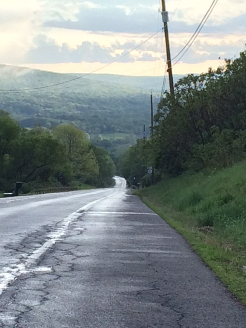 Then Jeffrey and I took our leave of Leslie and Ken, and continued west through overcast that turned into heavy rain.  We heard thunder, saw distant lightning, and climbed steep upgrades that were as long as a mile and a quarter, our uphill crawls followed by 35 mph descents.