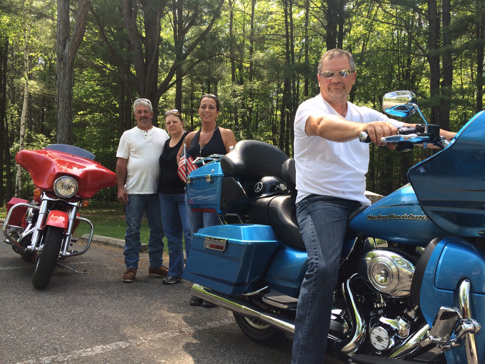 The air was fresh, but the sun sapped Jeffrey’s energy. The official temperature climbed to 88F (31C); the shadeless pavement was hotter. We stopped at a park to cool down, and met Roger, Julie, Connie and Ed, who rode their beautiful Harleys from Flushing, a Flint suburb.