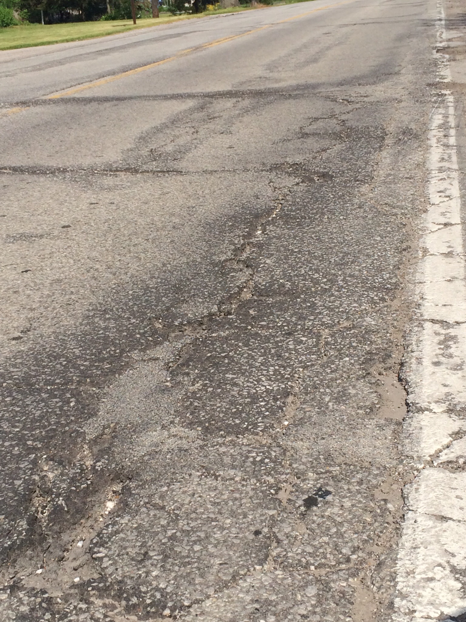 Our route became more rural as we moved away from Saginaw Bay. Many area roads, in town and country, are bad. Every dark spot and line you see here is raised asphalt, or a hole, and both make bumps. The trike tires, frame and seat absorb some of the shock, but the trike has no suspension. Bumps aren’t painful; they are wearying. We got pretty weary.