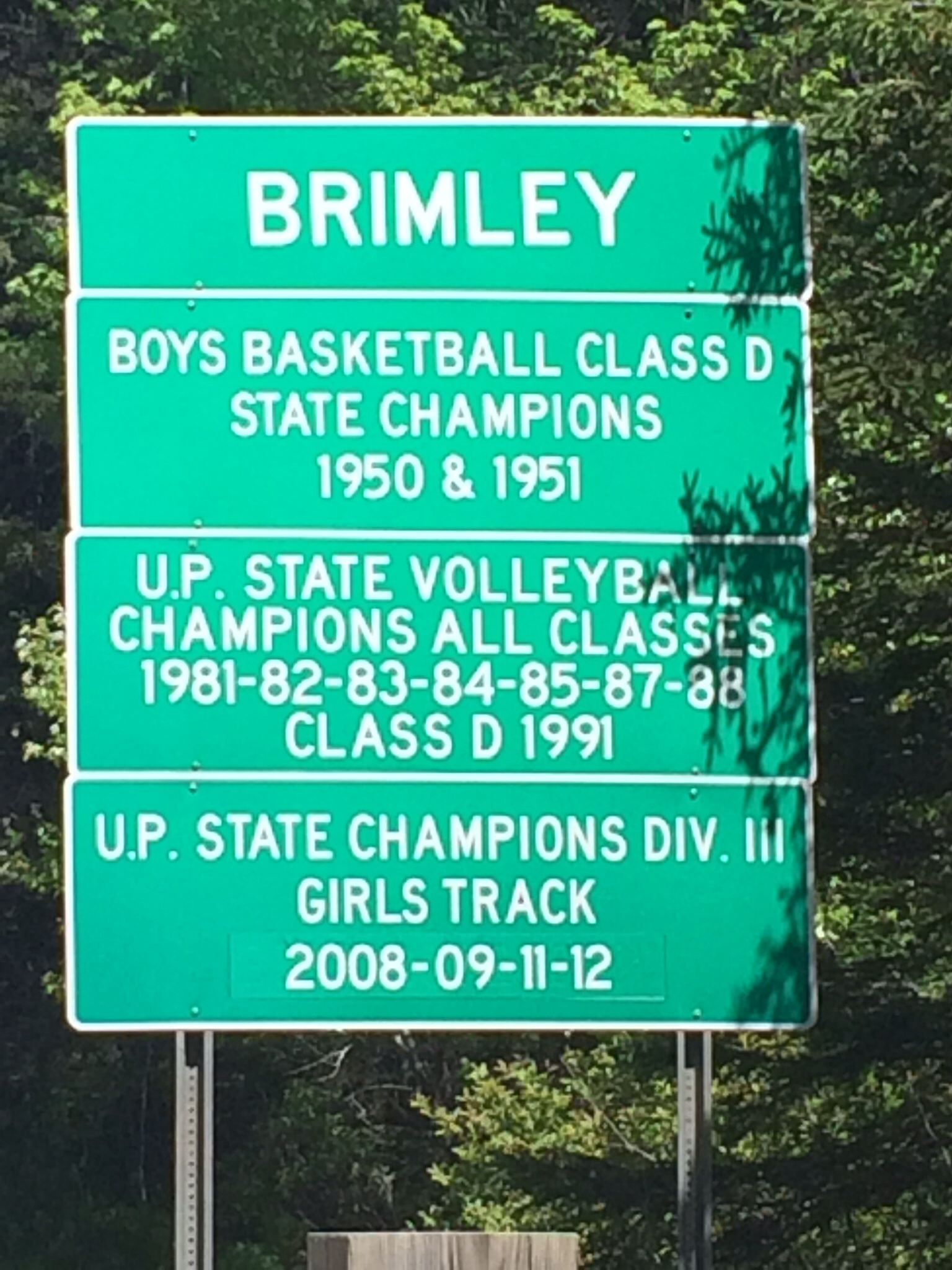 There wasn’t much to Brimley proper. Maybe the activity is at the nearby casino. We were greeted by the sort of sign common in these small towns, touting its high school students’ athletic prowess.