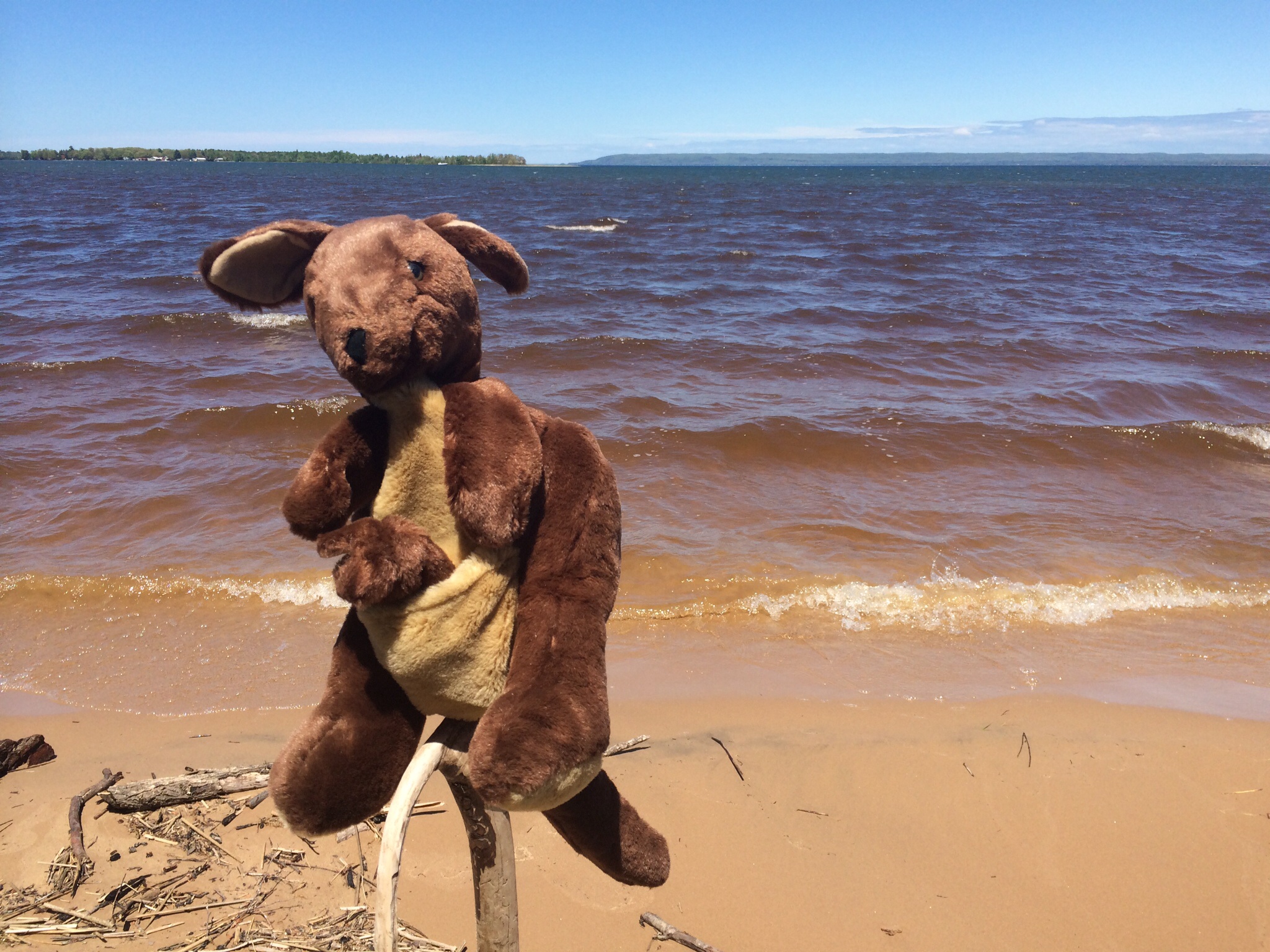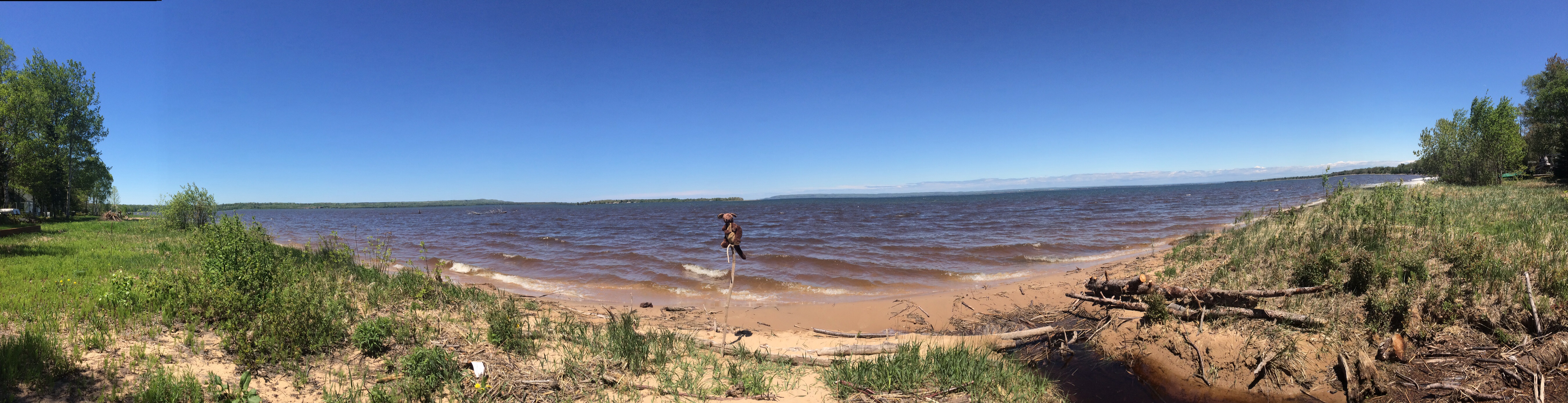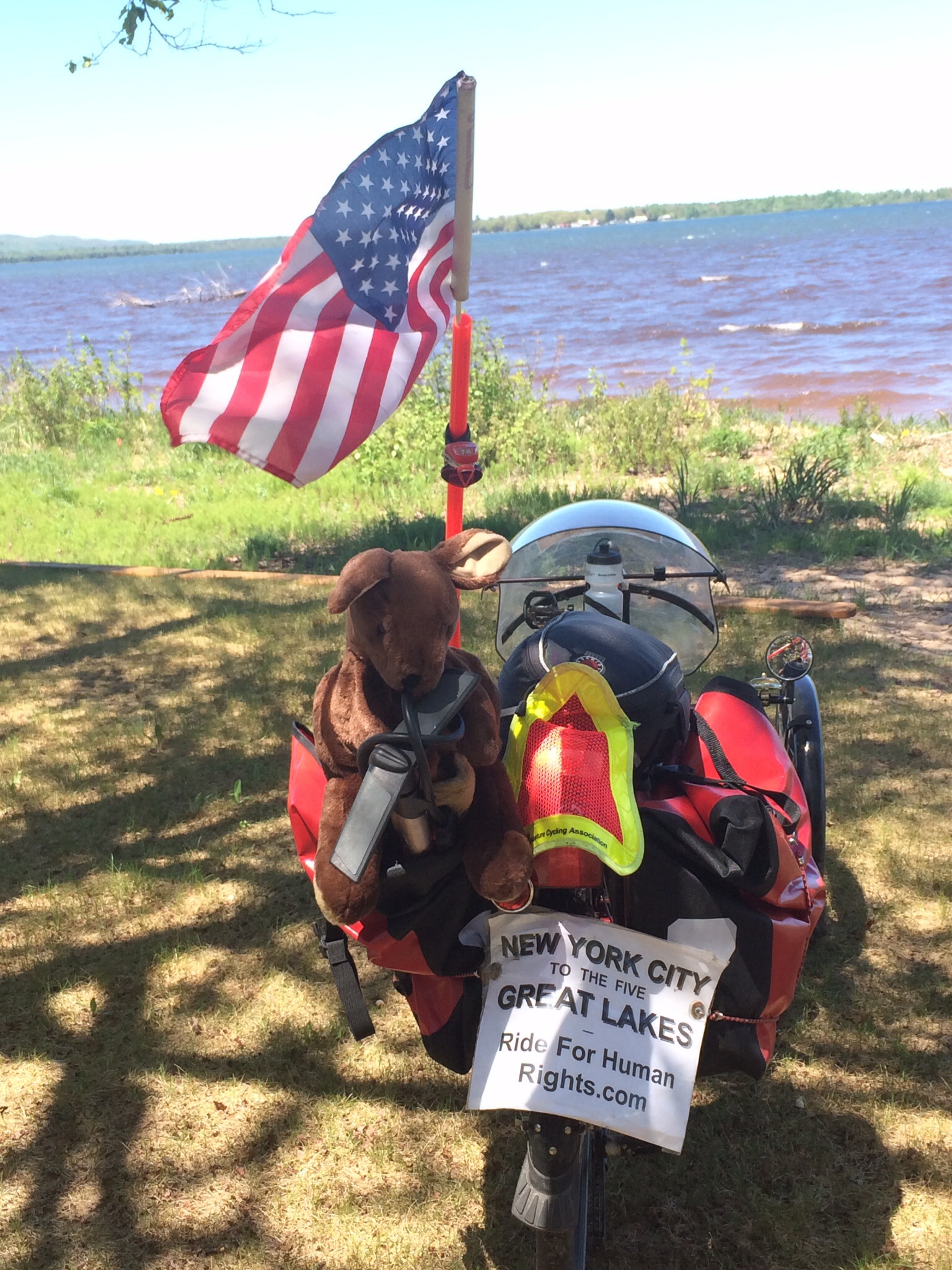 Jeffrey asked directions from two high schoolers, and took the opportunity to talk with them about Human Rights First. Then we rolled down a hill, around a corner, down another hill . . . to Lake Superior, the fifth of the five Great Lakes on our route, the most expansive freshwater lake in the entire world, big enough to hold South Carolina, cold enough that ice is still floating on it in June (but not where we could see). The dot marks our spot!
