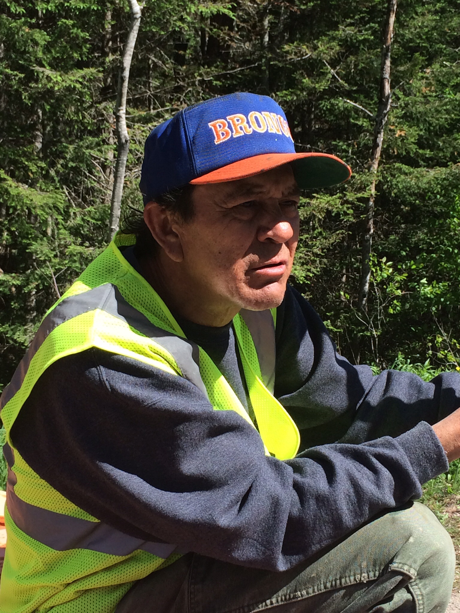 En route, a man in a truck pulled up and asked Jeffrey to be on the lookout for a demented woman who has gone missing and may be in the woods near the road. Jeffrey pedaled slowly and looked carefully but saw no sign of the woman. Then we met a most interesting gentleman: Denver, a road worker who coordinated 2-way traffic over a single lane in an area under construction.