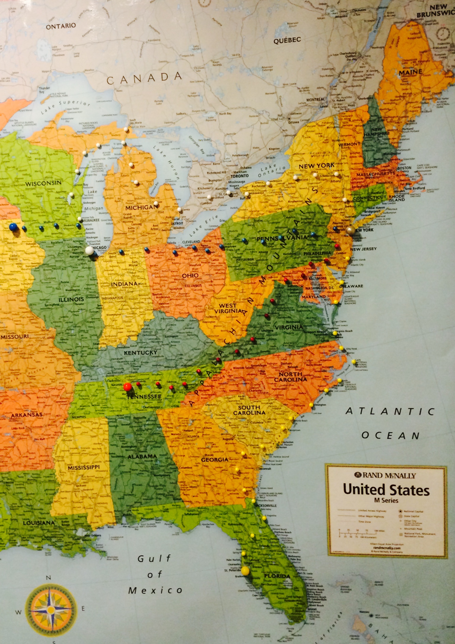 The pins on the map mark our farthest advance each day en route to Postville (blue), Nashville (red), St. Petersburg (yellow), and the Great Lakes (white).