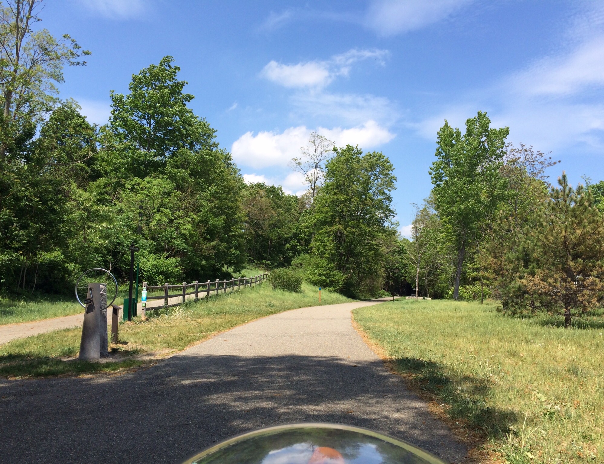 Today’s route had bad stretches, but many good stretches too. The sun was broiling hot, but the air in the shade was delicious. Being a puppet, my nose is useless, but Jeffrey enjoyed the piney woods. When we stopped to rest, he heard one of his favorite sounds: the hiss of the wind in broadleaf trees.