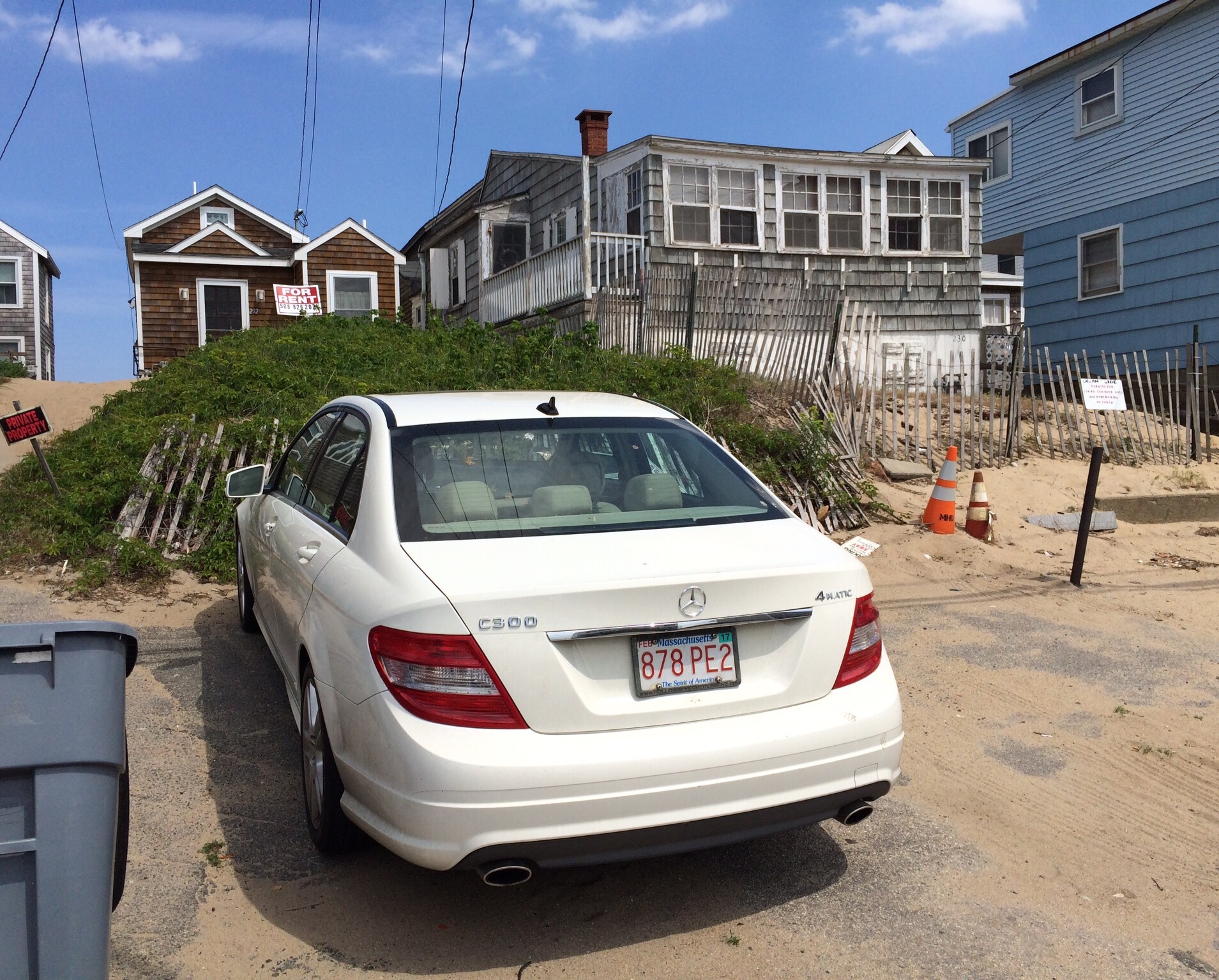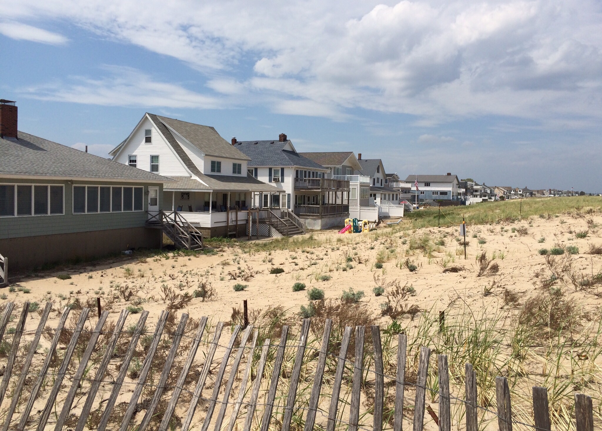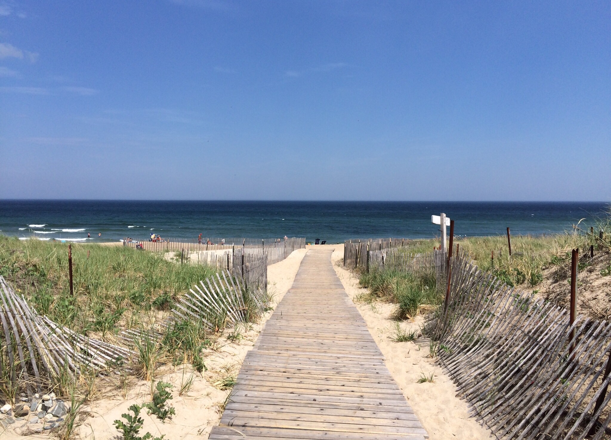 At the state line, we went toward the beach for a look. The sea at the left of this photo is in New Hampshire, at the right is in Massachusetts. The boardwalk is in Massachusetts.