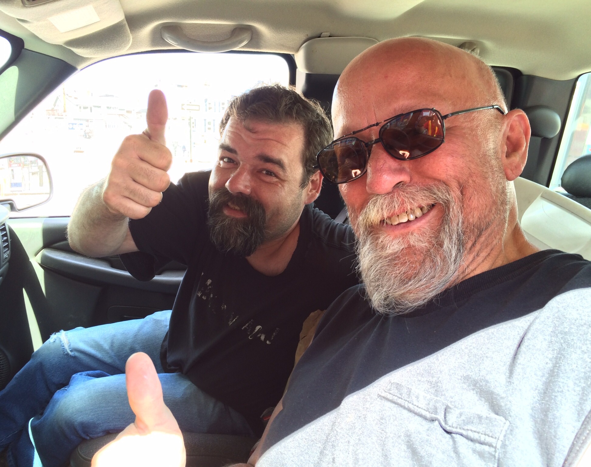 A couple of other guys read the sign today, too. Brian and Wayne pulled up in their truck where Jeffrey was drinking a sugary drink he had bought to power us ahead.