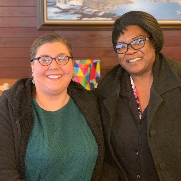 L to R: Sarah, Ronda. These Washingtonians believe in human rights for ALL, regardless of national origin. Ronda, who comes from a military family, reminds us that most Americans’ ancestors came from elsewhere, either (like Jeffrey’s grandparents) pushed here by persecutors, or (like many Americans with African ancestry) pulled here by kidnappers and enslavers. We’re happy that our new friends will follow our journey.