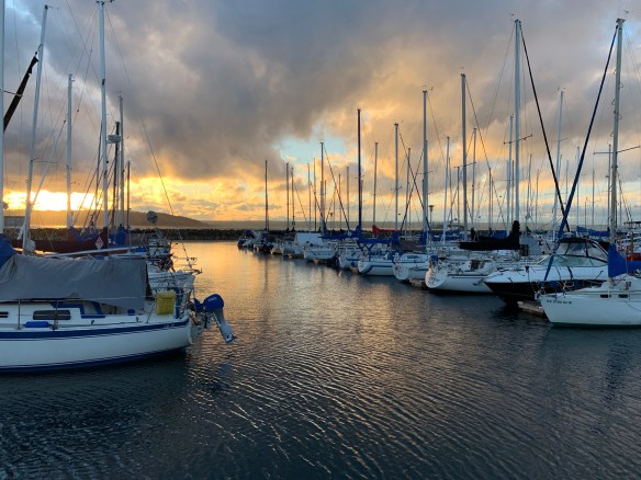 “Red sky at night, cyclist’s delight.”  The sky wasn’t quite red.  It may snow tomorrow.  But that won’t stop us.  We have places to go.