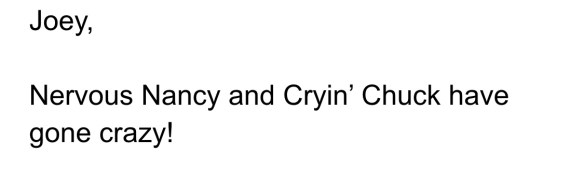 Jeffrey and I responded to a Web ad asking whether we would vote for “Sleepy Joe” or “Crazy Bernie” or President Trump. And the emails began.