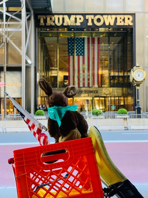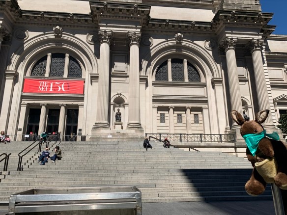 At the Metropolitan Museum. Joey, with a pretzel cart pole up his behind, is masked in a clean plastic dog poo bag, impermable to COVID-19 virus . . . and to oxygen. Like bleach, a mask that is safe for a puppet can kill a human!