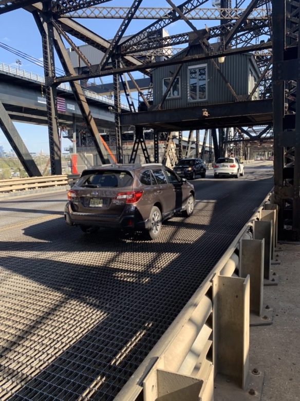 On a bridge west of Jersey City, a deck opening trapped our rear wheel. It took Jeffrey several tries to extract the wheel. Then he vaulted a rail to a barricaded walkway, pulled the undamaged bike and me after him, and saluted the irritated trucker who’d halted behind us.