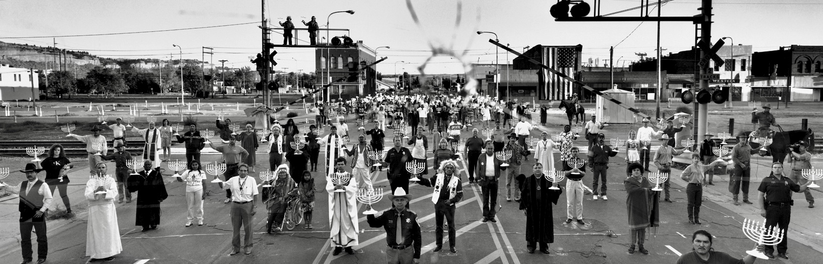 Frederick Brenner: “Citizens Protesting Anti-[Jewish] Acts, Billings, Montana, 1994”. Priests, police, members of First Nations, football players, cowboys, and others, hold Hanukkah menorahs in solidarity with local victims of bigotry. THAT is our America.