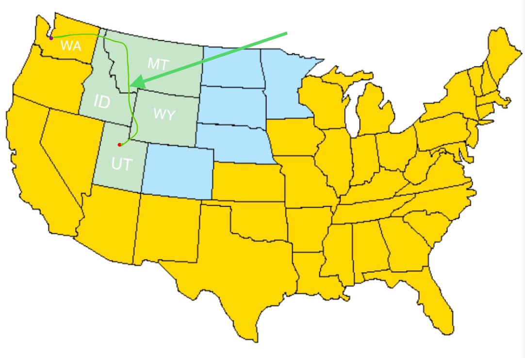 Here’s our imaginary 2020 route through virtual Washington, Idaho, Montana, Wyoming, and Utah. From 2011 to 2019, we pedaled from NYC to all the yellow states.