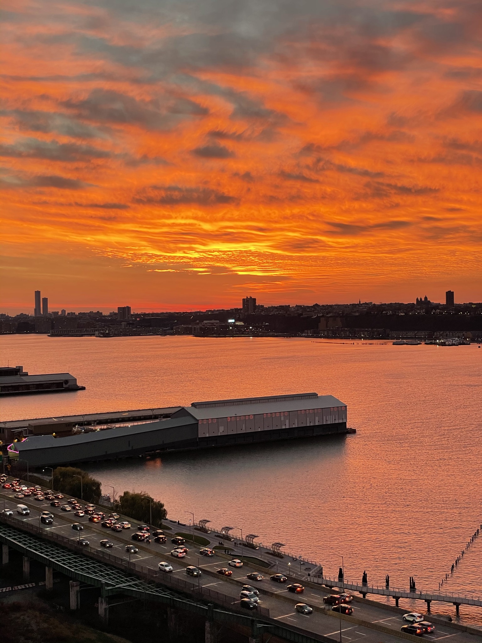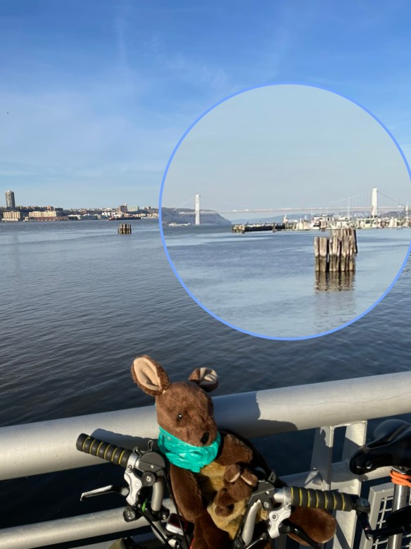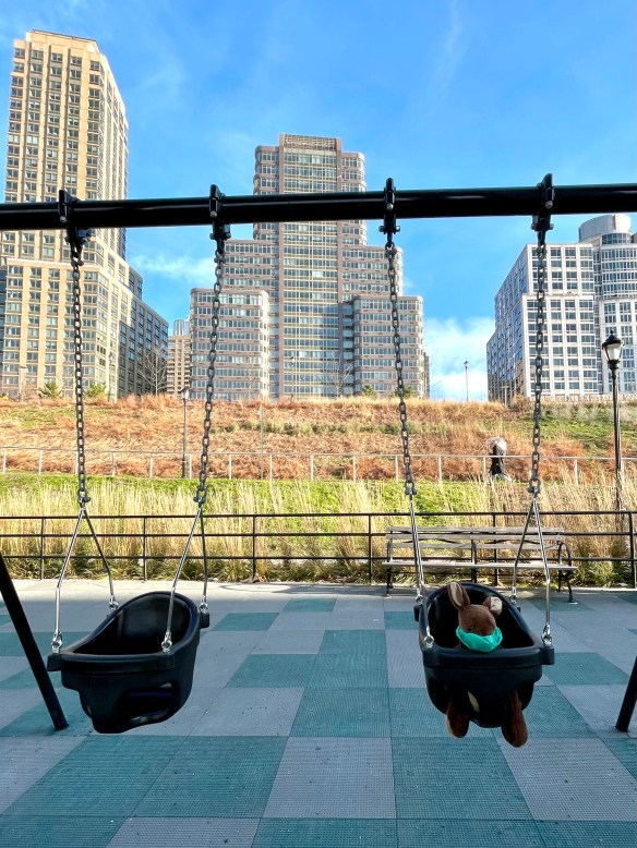 Back in our neighborhood: on Pier 1, with the George Washington Bridge 5 miles (8 km) upriver; historic Hudson River machinery; swingin’ in a new park; sunset seen from our dining room.