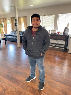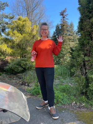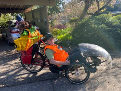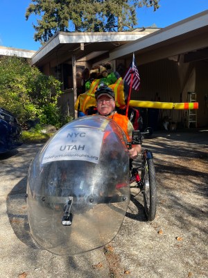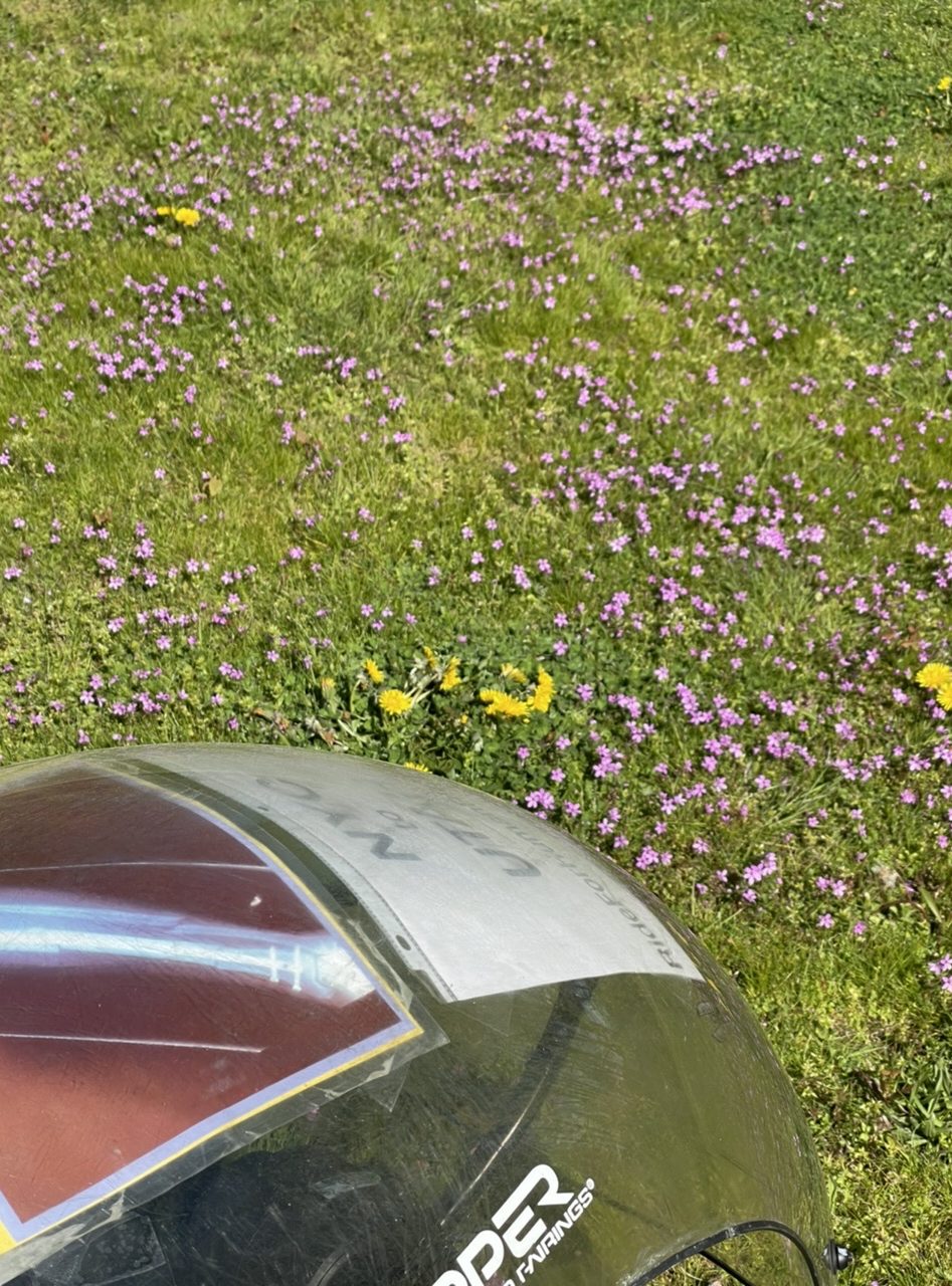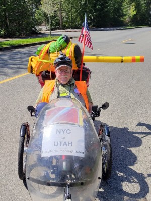 And away we went!Fields of flowers.Woods and ferns.Along the Cedar River.Lebanese halva: good cycling fuel.A purple paraglider landed in a nearby field. Jeffrey wasn’t quick enough to photograph it.Marylander Jocelyn moved to Texas, then last fall settled with her family in Issaquah. She’s happy here. We had a delightful chat about the thoughtfulness of the local outdoorspersons, the sad state of American medical care, and the cold shoulder our laws give to worthy immigrants and refugees. Jocelyn gave us valuable route advice, and thinks we’ll make new friends on this Ride despite the recent coarsening of public discourse.Rich is a retired tech whiz. When Jeffrey saw his hiking poles, he took Jocelyn’s advice to confirm her route suggestion. Rich agreed that some of the trails on our route are not as nicely surfaced as the trails and bike lanes that brought us from Seattle. Rich said that if we don’t mind sharing space with high-speed motor traffic, it wouldn’t be unreasonable to proceed on I-90. Jeffrey snapped Rich . . .. . . and Rich snapped Jeffrey. I was in a bag.East of Issaquah, bikes are permitted on the I-90 shoulder. We pedaled up and rolled down for 17 noisy miles.Sometimes we dodged gravel and debris. Most of the surface was far better than what Jocelyn and Rich said were the alternatives.In North Bend, we met Euelle. He’s a kind, cheerful Washingtonian who spent most of his youth in the Philippines. He knows what it is to be bullied, yet he doesn’t let such incidents spoil his love for this area and its overwhelmingly good people. He invited us to park our trike in a spacious motel meeting room.
