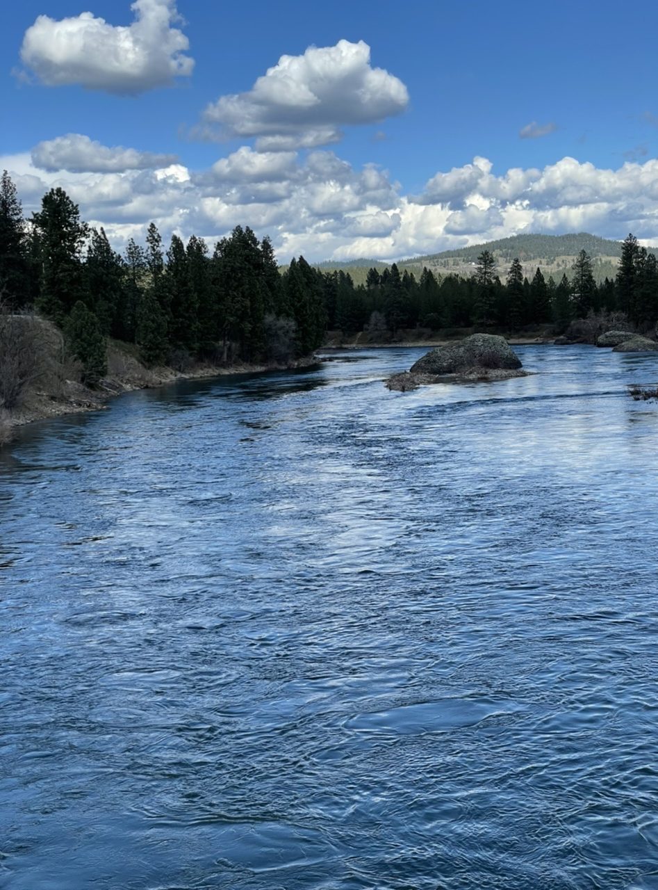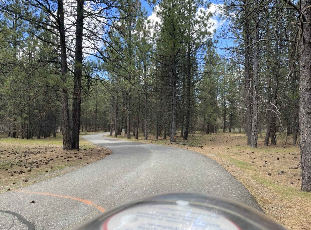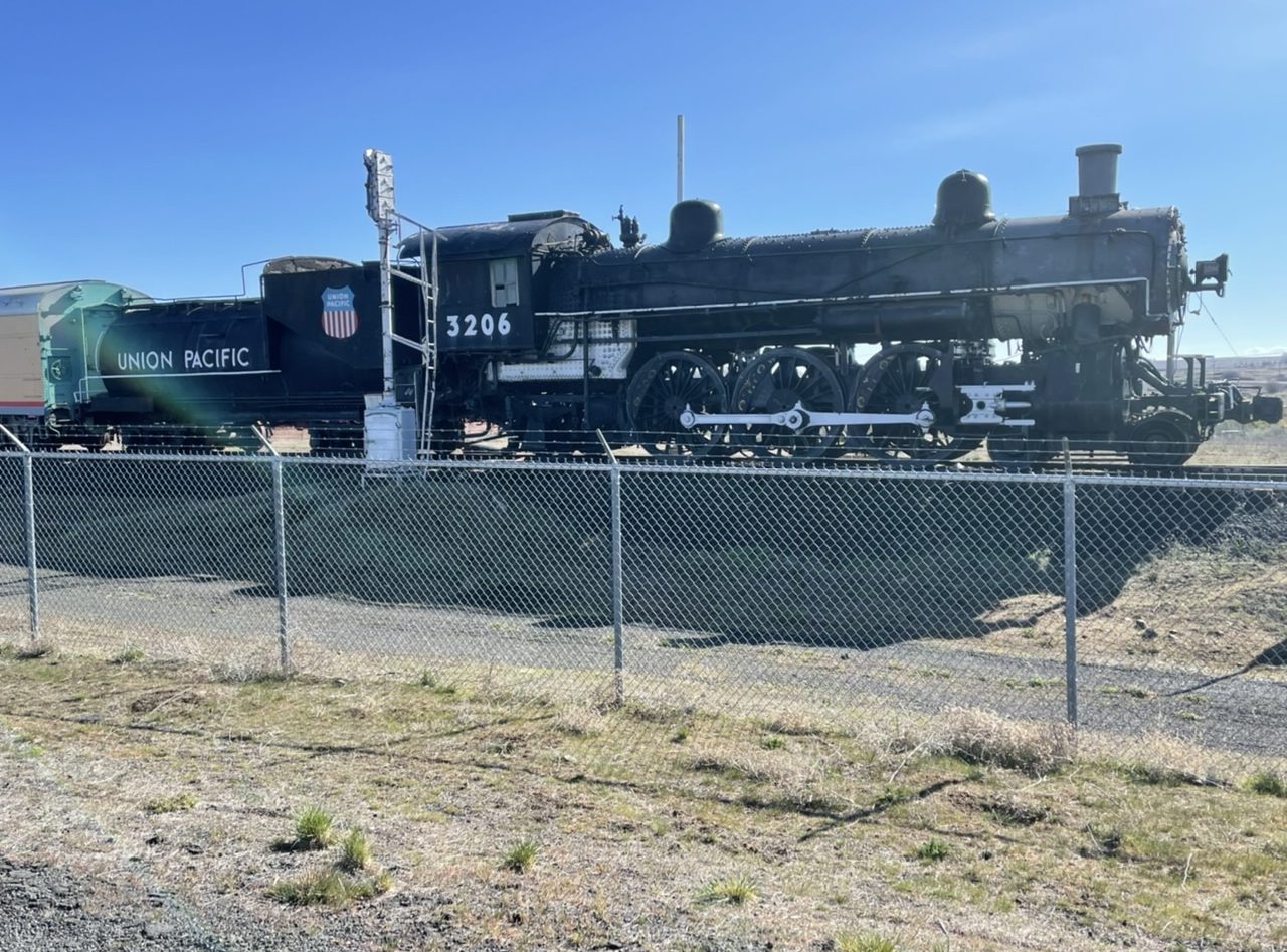 Photos don’t convey the size of these cultivated fields. We saw tumbleweeds rolling and bouncing, just like in old cowboy movies, except the movie weeds were bigger.Horses.A Union Pacific locomotive at the Inland Northwest Rail Museum.The interior of the last Spokane trolley car.A gray military plane. Colorful jets descended to the commercial airport a few miles away.We saw espresso shacks in every Washington town.Spokane River, seen from a Centennial Trail bridge.A bit of the Trail. It winds through woods and fields, and past back yards. It’s smooth, quiet, safe. No motor traffic. There is a strong pine scent.