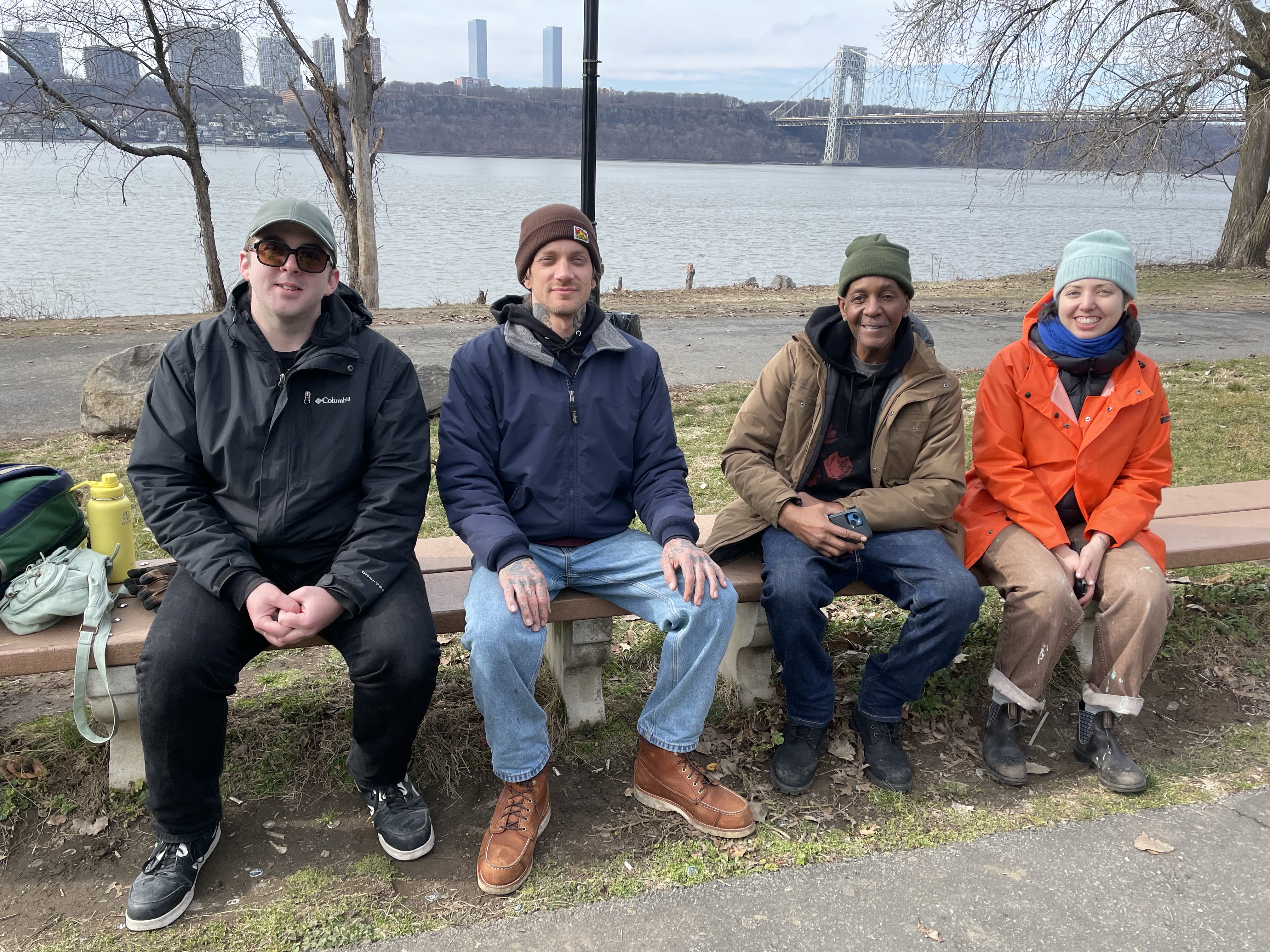 On our way upriver, we had passed a movie crew, a common sight in NYC. Jeffrey disabled our bike’s rear brake, kicked the rear wheel more nearly into place, and gingerly pedaled us back downriver, hoping to find the crew—and tools.