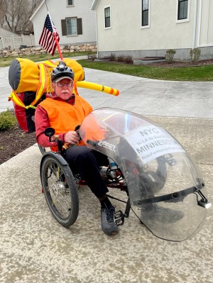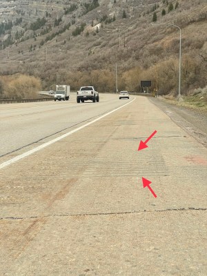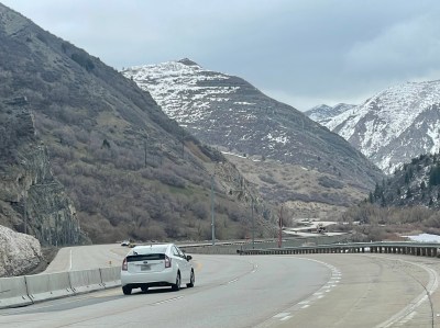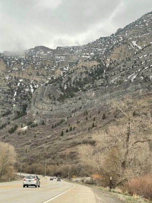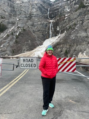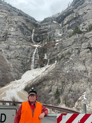 Look closely. The dry West displays geology that we don’t often see in the lush green East except in road cuts..The shoulder was good, not perfect. This stretch had a benignly aggressive rumble strip running parallel to the motor lane, and less aggressive but annoying perpendicular rumble patches every few yards. A two-wheeler could avoid the patches. Our three-wheeler had to rattle over them. Sometimes the shoulder roughened, narrowed or disappeared.We stopped to see Bridal Veil Falls. Water cascaded down the cliff, into the remains of an avalanche. Professional photographer Amy took Jeffrey’s photo. Amy drove to Utah with a companion to photograph a wedding. Amy also is a ski patroller, a rafting guide, a kayaker, and more. She has lived and worked in wild areas all over the USA. She posed ironically by the “Road Closed” sign; she believes in open roads. For travel. And for opportunity for all good people—including immigrants and refugees who get free help from Human RIghts First.