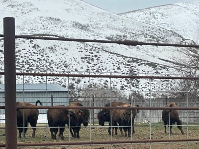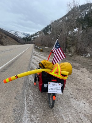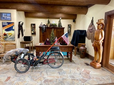 Mostly the road climbed.Sometimes the road descended—which meant even more climbing later. (Sigh.)Domesticated American bison, a.k.a., buffalo.The road became steeper. On the Rides, as in life, one takes challenges as they come. What else can one do?Daniels Summit Lodge. Elevation 8000’. The only shelter for many miles.Snowmobile heaven. Is the near machine preaching to the choir?Franziska isn’t short. The snow is tall! She and Jeffrey had a great conversation in the parking lot. Franziska, an HR executive vacationing from Germany, is mindful of her country’s history, as we should be mindful of ours. Recently she helped a young Syrian refugee family get a start; the father, trained as an auto mechanic, now repairs bicycles.The lodge staff was expecting us. Salina, Michelle, and Becky are enthusiastic about the Ride. We received a warm welcome—as they welcome the persecuted who seek shelter in America.We too are grateful for shelter. Soon after we arrived, a snowstorm began.Due to the weather, our Sprint 26 got a premium parking spot—in the lobby.Shayla saw to it that we got dinner before the dining room closed. She knows how undeservedly harsh American law can be to immigrants. Some of her family has lived it. Shayla is now a friend of the Ride, and of HRF.