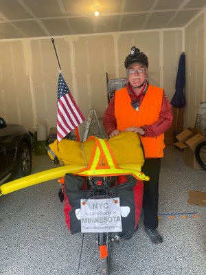Jeffrey, ready to roll from Susan’s marvelous garage after she stuffed him with perfectly delicious scrambled eggs, served with her moving invocation of the Almighty’s help and blessing. I was stuffed in the yellow dry bag.