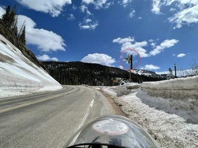 The final climb was gentler than up to Rabbit Ears, and because we started at over 8,000’ in Walden, it was much shorter. When I spotted the second Webcam (enlarged in the red circle), I knew we were 1.2 miles (2 km) from the top of the pass.