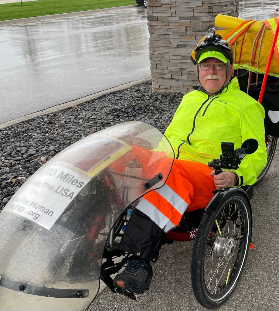 Here’s Jeffrey, wearing rain gear supplied by Nancy, ready to roll into this morning’s pelting rain.
