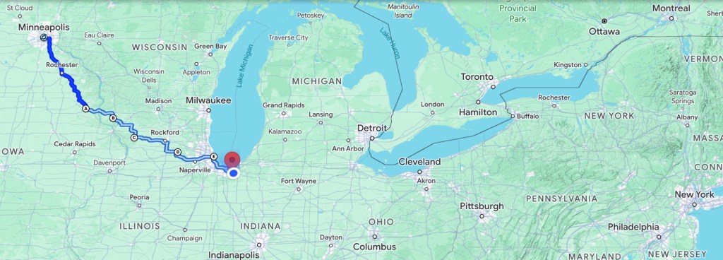 Our road choices worked out. Taking bike paths got us safely through Chicago traffic. Leaving them in Hammond, Indiana, shaved an hour off our journey.