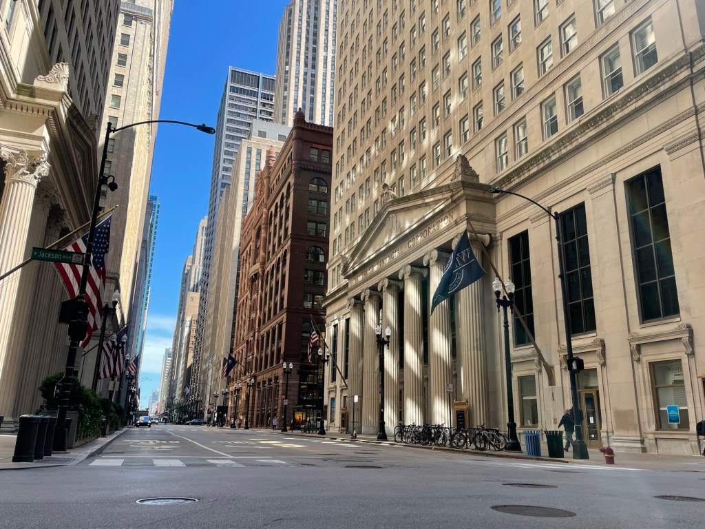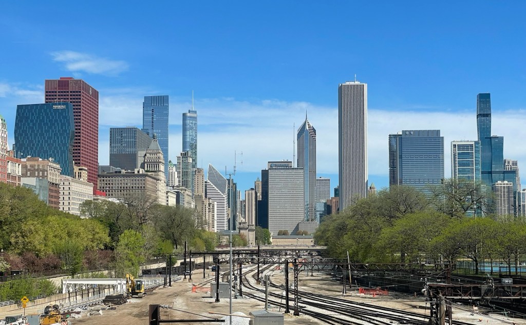 The mug recites our rules of the road.That’s us, rolling down the driveway …… and waving our thanks to our wonderful hosts.Most of our route through Chicago was on bike lanes.At Union Station, Jeffrey pedaled us onto the sidewalk to avoid a traffic jam.We passed LaSalle Street—Chicago’s Wall Street. Jeffrey was a summer associate at a LsSalle Street law firm 45 years ago. View from a bridge leading to the bike path along Lake Michigan.