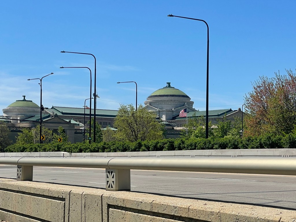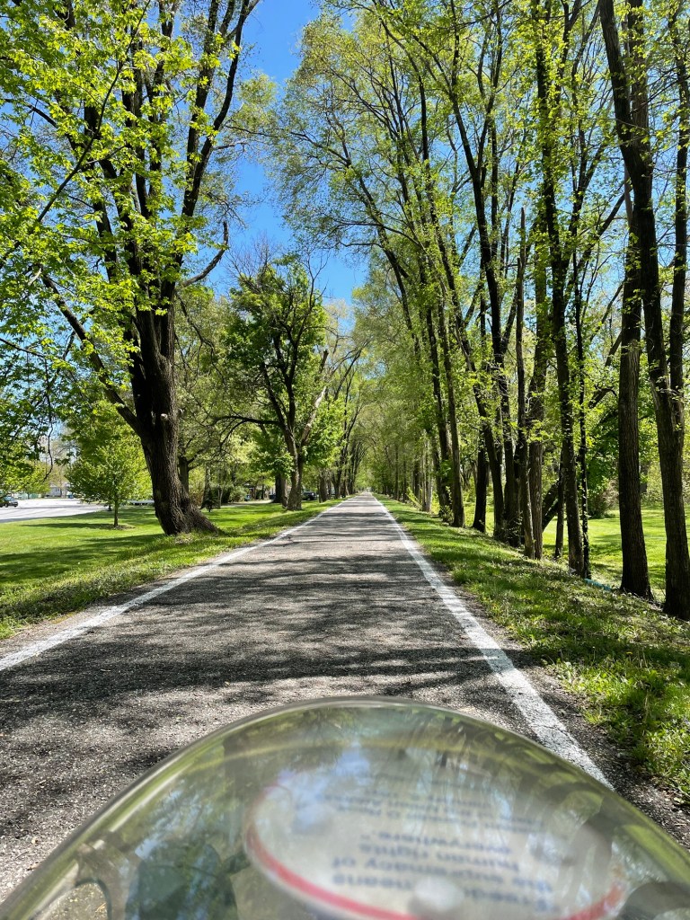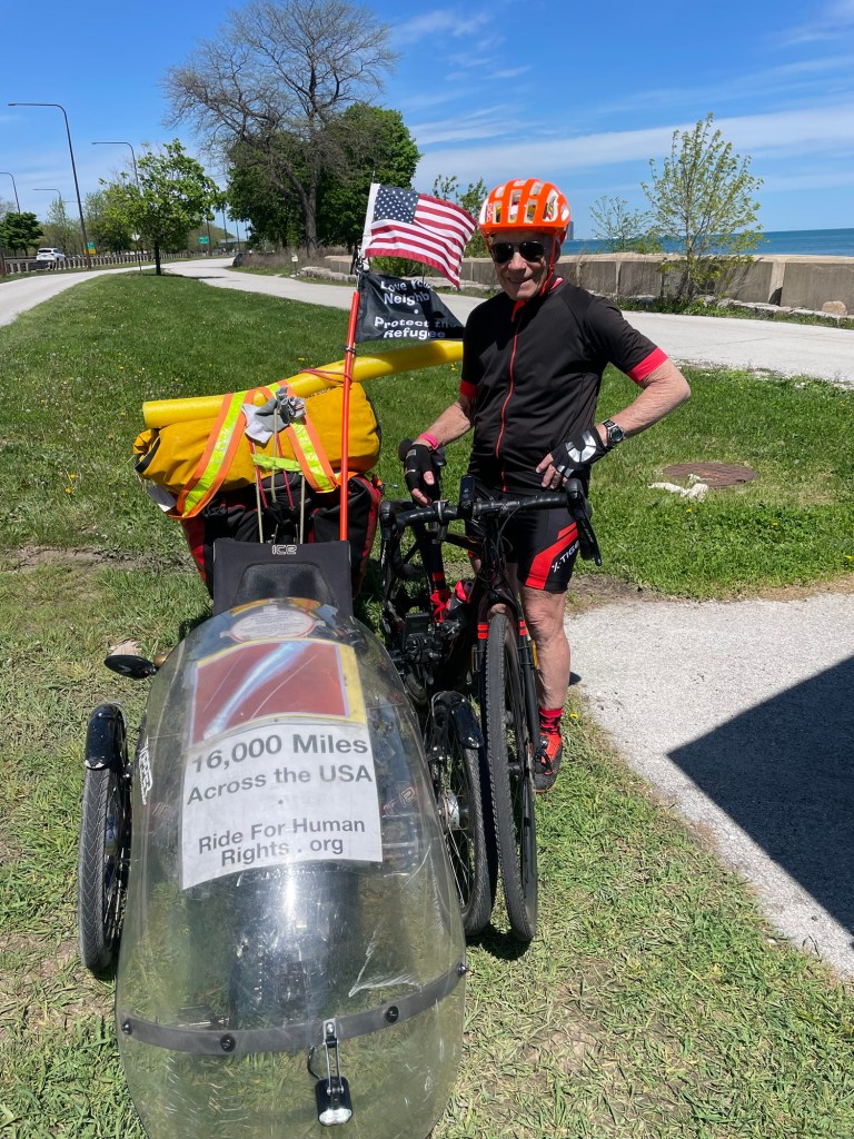 Mary immigrated from Croatia as a child. She ran her late husband’s medical practice; he did surgery, she did the rest. Mary told us an eye-opening tale of her husband’s evident murder during their vacation in a Caribbean island nation. She and Jeffrey like seeing our country on 3 wheels and by car. Mary likes Croatia too: it’s quiet and safe.Mike is a pediatrician who lived in NYC during his medical training. For better and worse, he considers NYC to be unique in the world. Mike is sympathetic to migrants—and concerned. Jeffrey reminded him that immigrants cause less disease and crime than American natives like Jeffrey.We passed the Museum of Science and Industry, near the UChicago campus.After another hour of winding paths and bumpy streets, our GPS announced at this unmarked spot, “Welcome to Indiana”.The Indiana bike path crosses Wolf Lake.An hour later, Jeffrey had had enough of bumpy bike paths. We could go much faster on main roads. So we did.