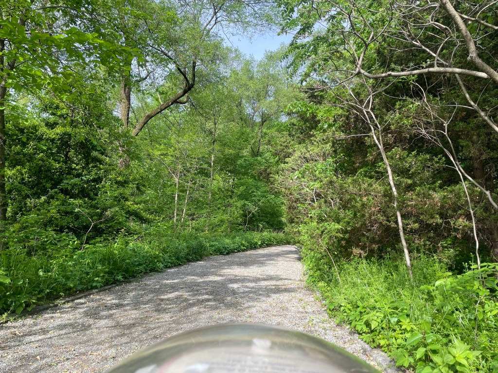 The path splits in a heavily trafficked area, sending cyclists through woods and pedestrians along the river.