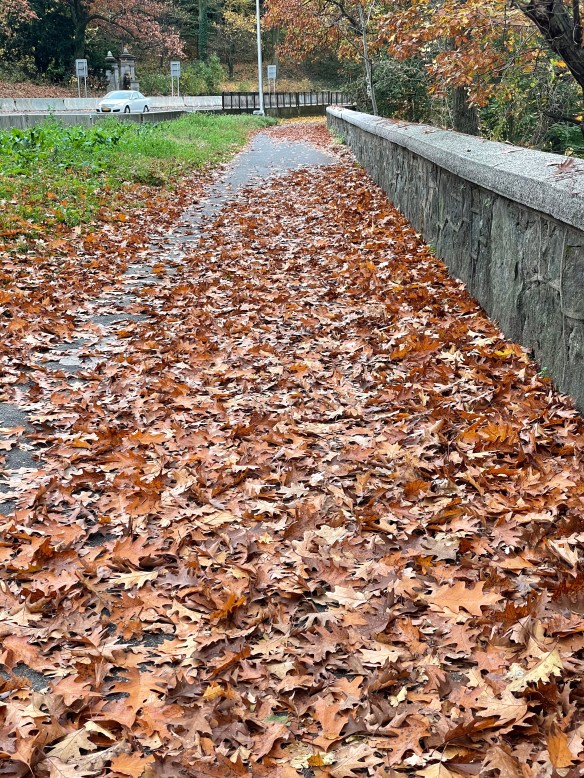 Autumn leaves hide cracks, holes, tree roots. NYC cyclist beware!