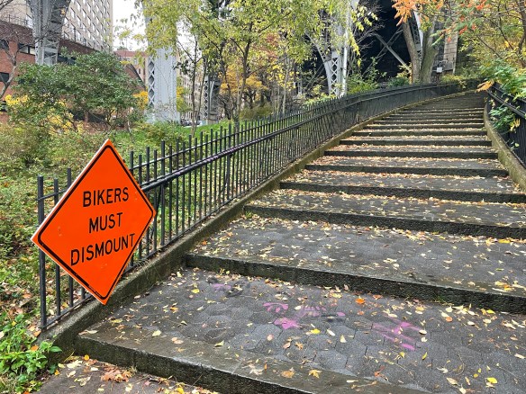 Bike path construction requires a detour between W. 100th & W. 125th Streets. They think we’re going to bike up these stairs??!!