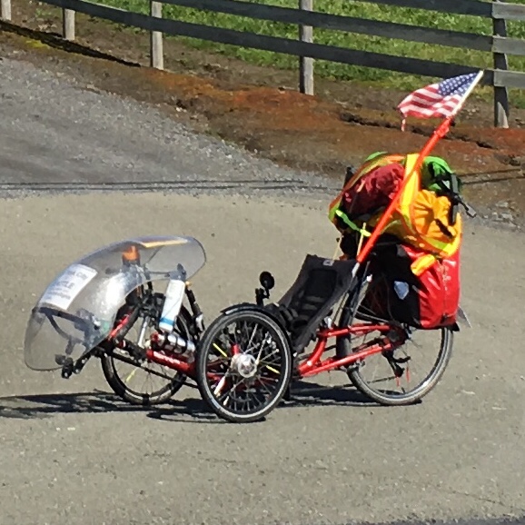 . . . on a machine flying the Stars and Stripes. People assume the best of him. No one fears an old “white” guy on a recumbent bike.