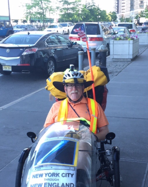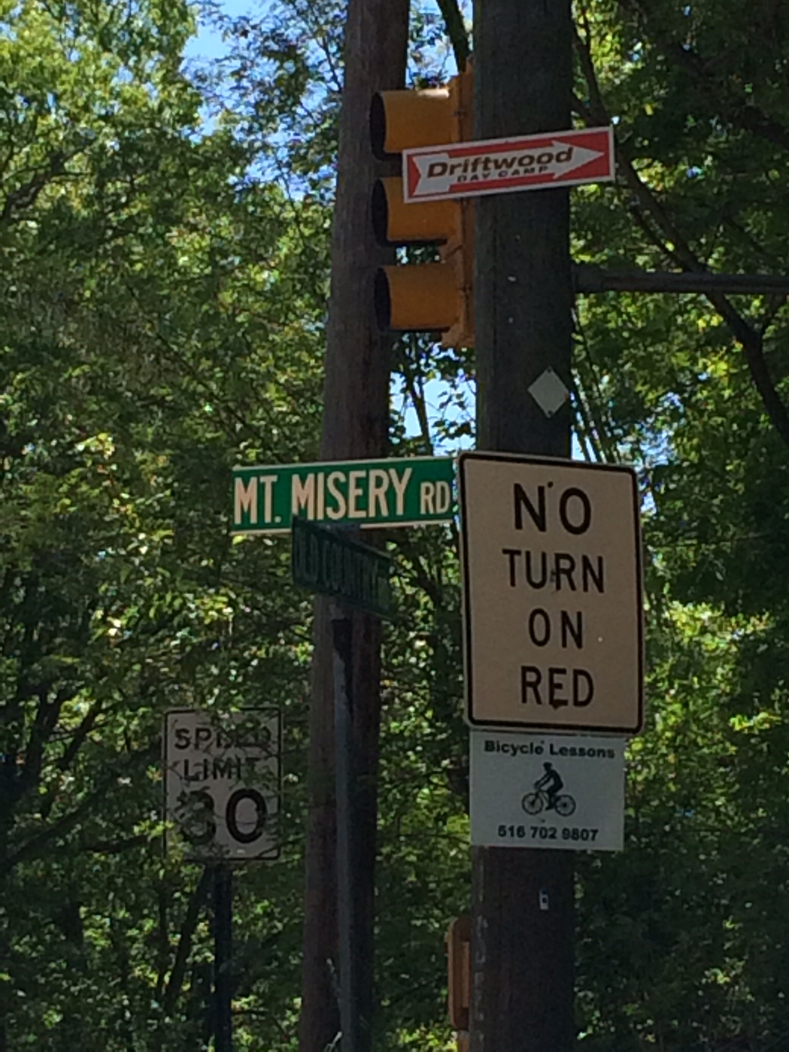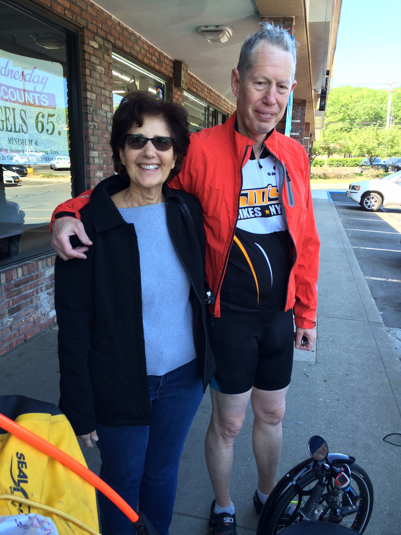 We’ll end today’s post with thanks to Jeffrey’s friends Sidney (in the biking shorts) and Madeline. Sidney waited for Jeffrey in Roslyn Heights, NY, and led him 20 miles to Commack over a colorful route that included the highest point on Long Island (pictured below; note the name of the road, and the sign offering bicycling lessons!). Madeline drove out to retrieve Sidney as Jeffrey continued on to Stony Brook. They’re people who think nothing of spending a day helping others. We’re grateful that today, their gift of time helped us.