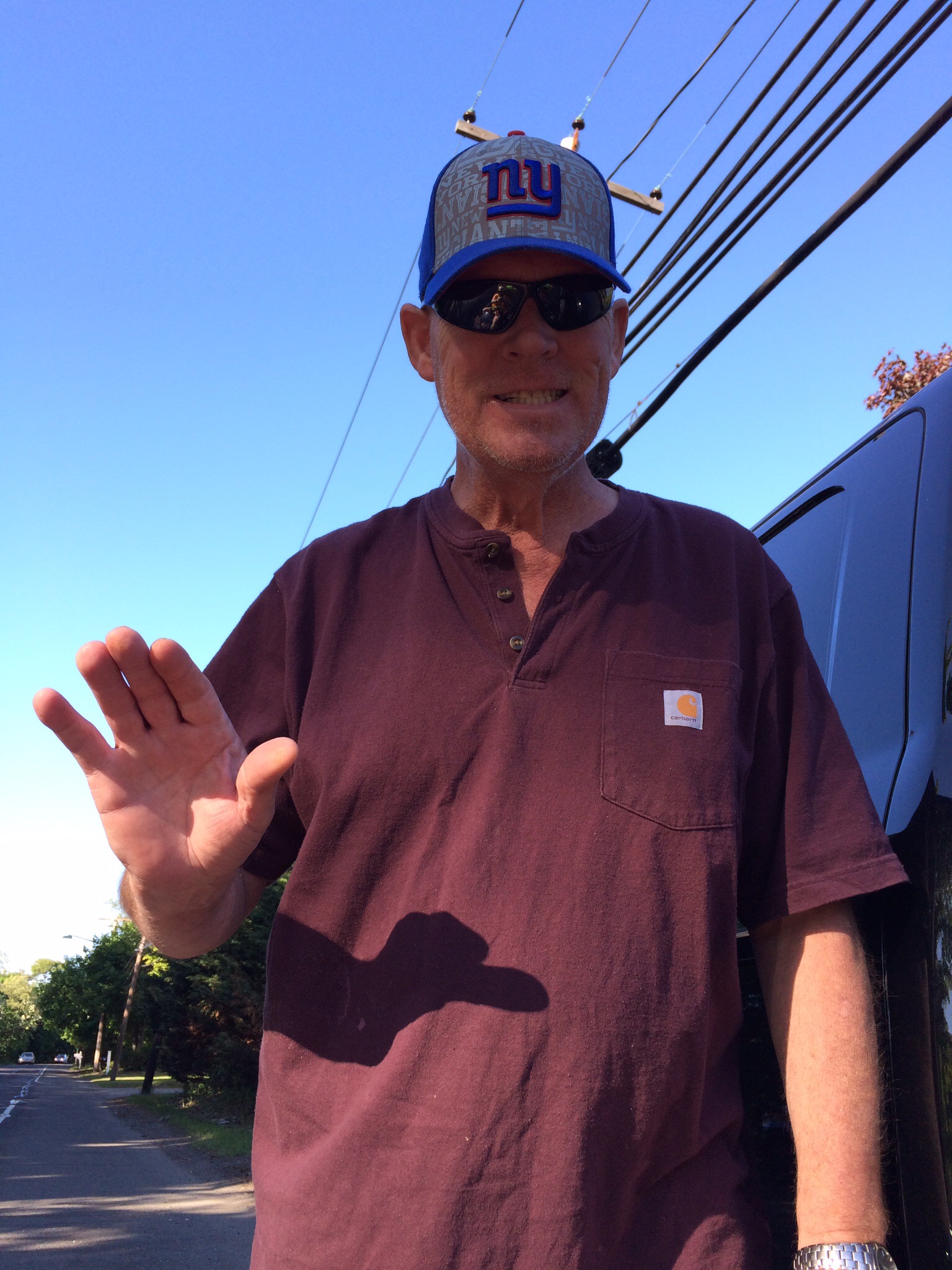 Mike drove past us in his truck, flagged us down, and evidently having read the sign on the back of our bike, said, “You inspired me.” He handed Jeffrey all the cash in his wallet, and said his business may contribute more. Jeffrey asked to take a photo of a nice guy. Mike is waving, not fending us off.