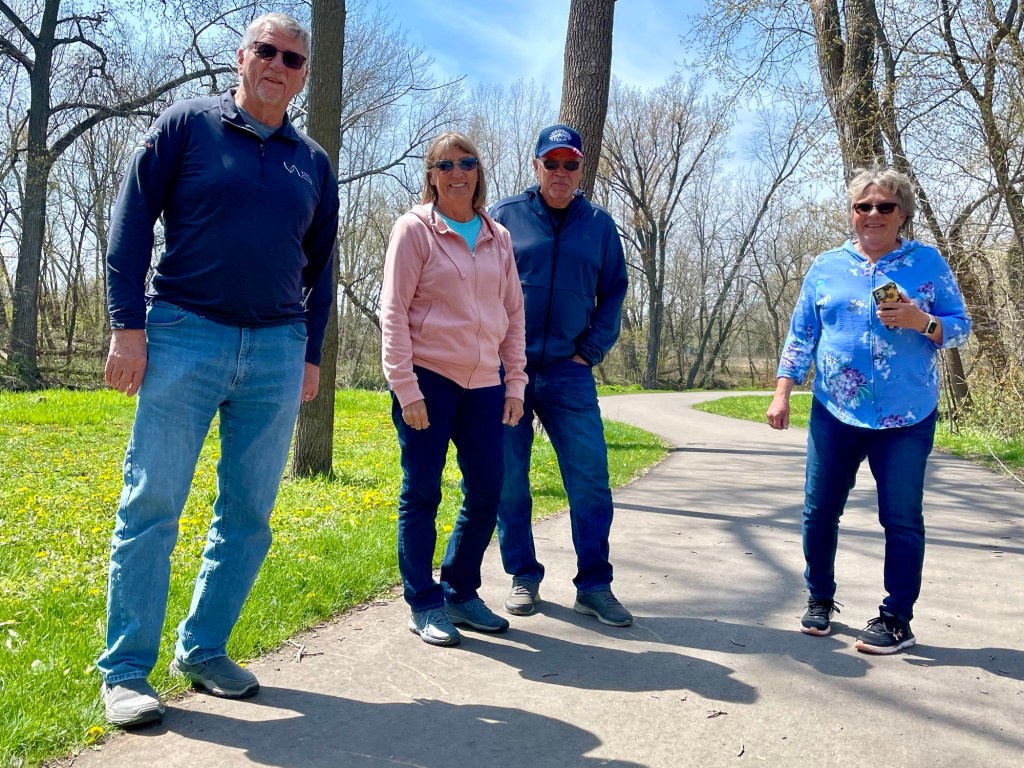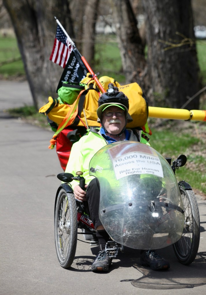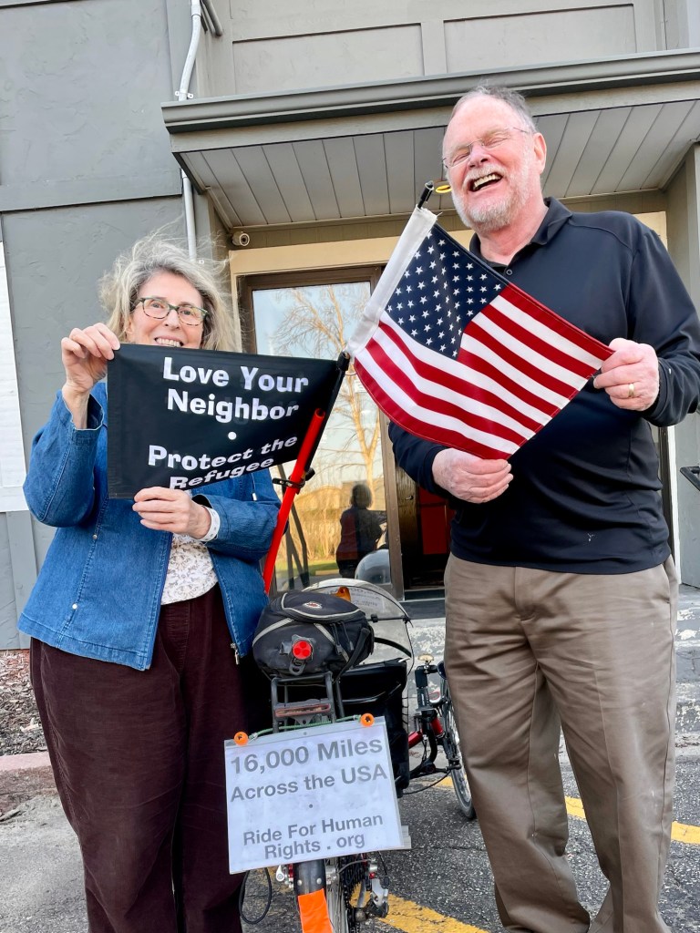 Mike, Julie, Terry, and Linda, are from northern Minnesota. Terry affirmed Jeffrey’s debunking of some disparaging myths about migrants.Our kindred spirits! Louise, a semi-retired microbiologist; and Alan, who planned, built, and installed infrastructure for an electric utility; do local 20-mile trike treks. Louise shared her thrill at visiting Abraham Lincoln’s home in Springfield, Illinois, in happier political times. We all had a spirited, and sometimes mournful, discussion about the state of American education, politics, and human rights.Minnesotans Jeanne and Dave are our kindred spirits too. They saw the sign on our rig and offered blessings that we gratefully received. They handed Jeffrey a generous donation to Human Rights First.
