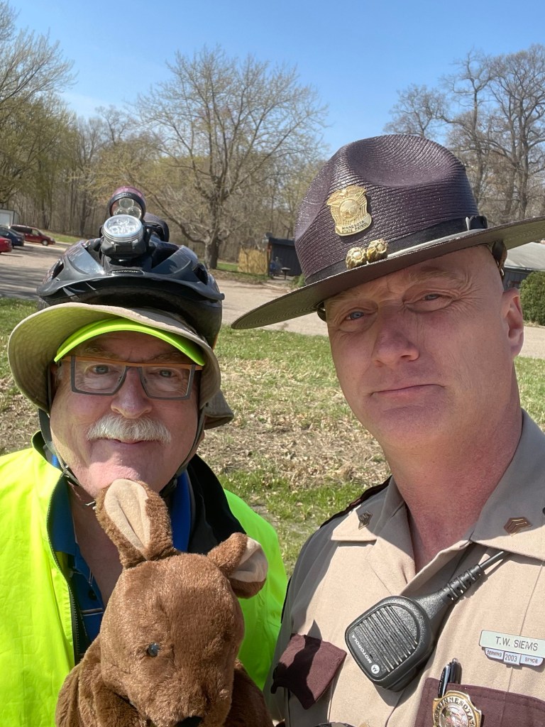 L to R: Jeffrey, Joey, Sgt. Siems. He followed us on the shoulder to guard our rear for 1 ½ miles to the next exit. (Selfie courtesy of Sgt. Siems.)(Note to Sgt. Siems: At the on-ramp where we left US 52, we saw no sign banning cyclists.)