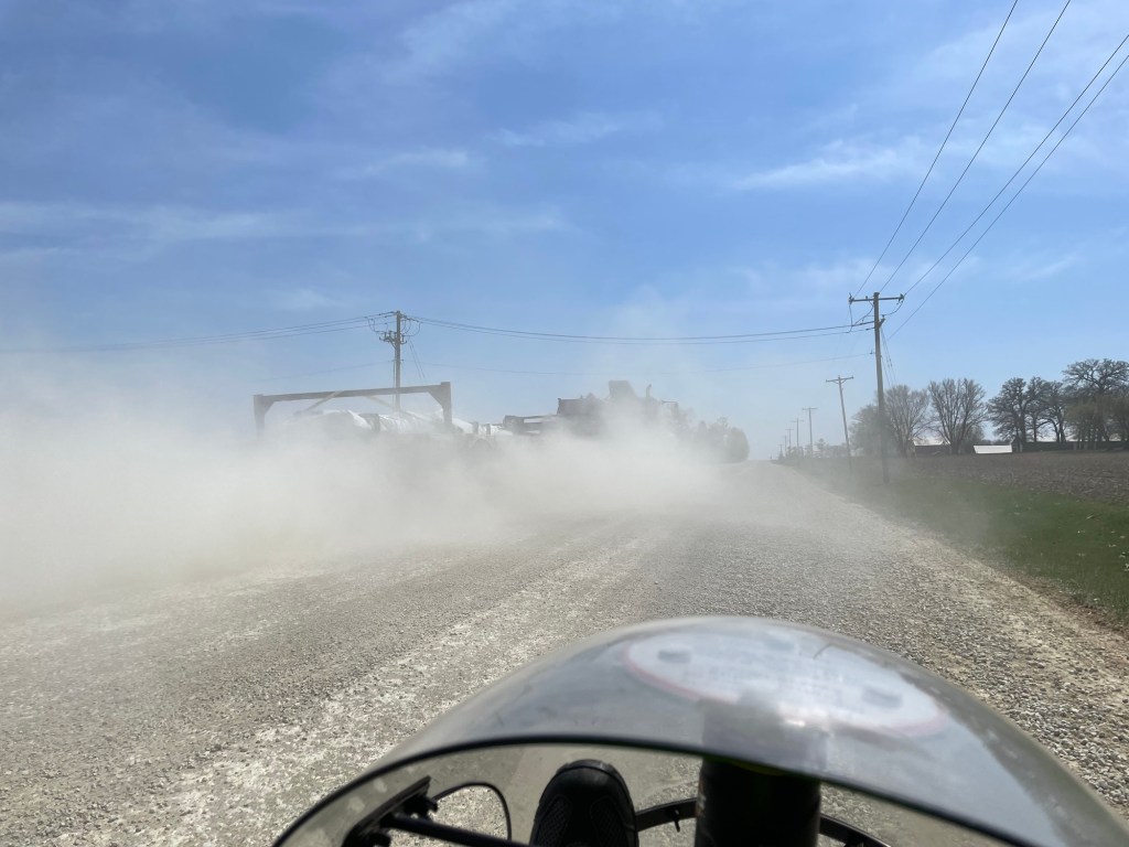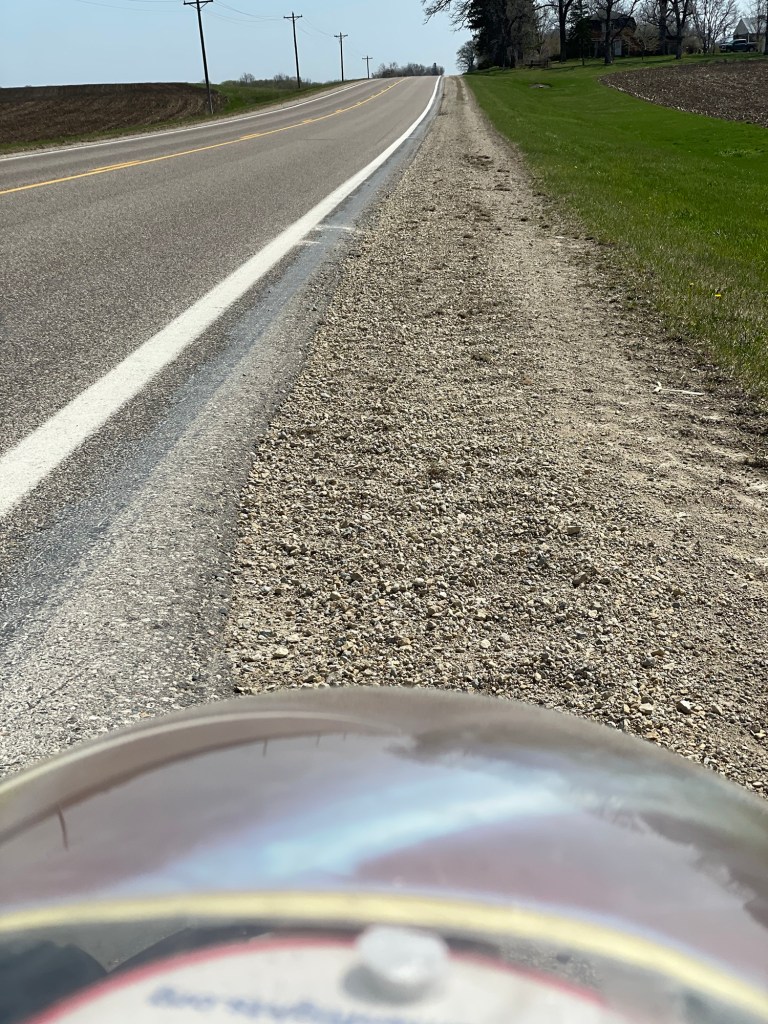 Four-lane US 52 is much noisier and busier than the country roads that brought us there. But it was the shortest route to the day’s destination, and the wide smooth shoulder kept motor traffic at a safe distance.
