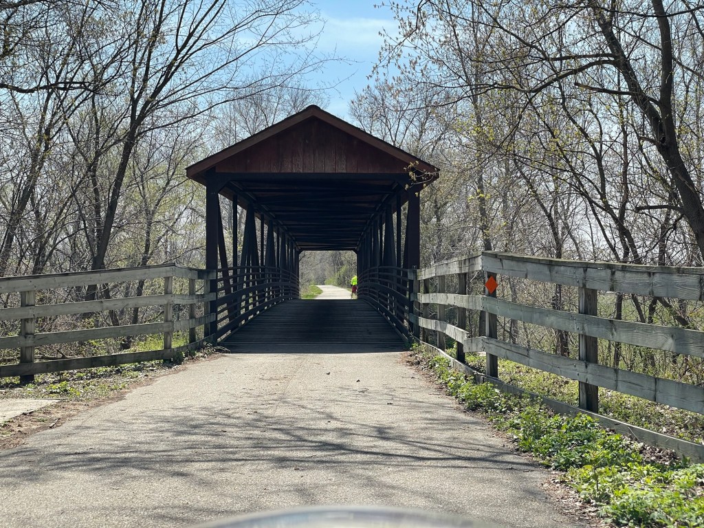 Covered bridge.Greenery provided occasional relief from the all-day 25 mph headwind.