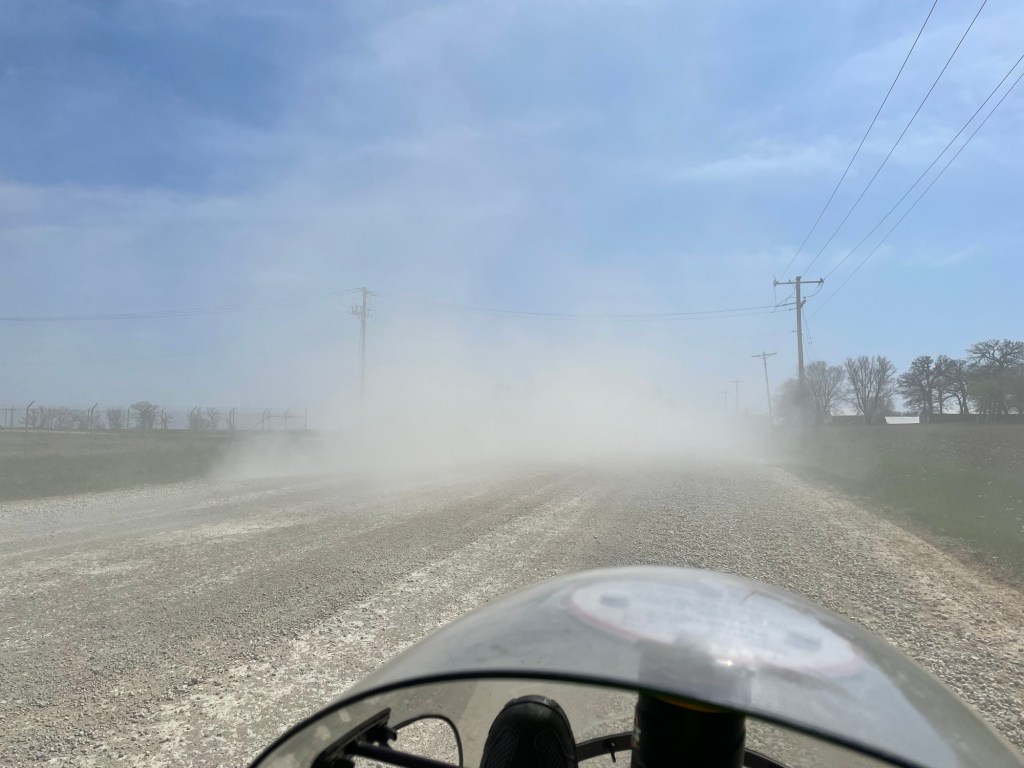 The bad aspect of the cyclist route is that 6 miles of it was on hilly gravel roads. Gravel cuts our speed in half and adds to our effort. Passing vehicles kicked up clouds of suffocating dust.