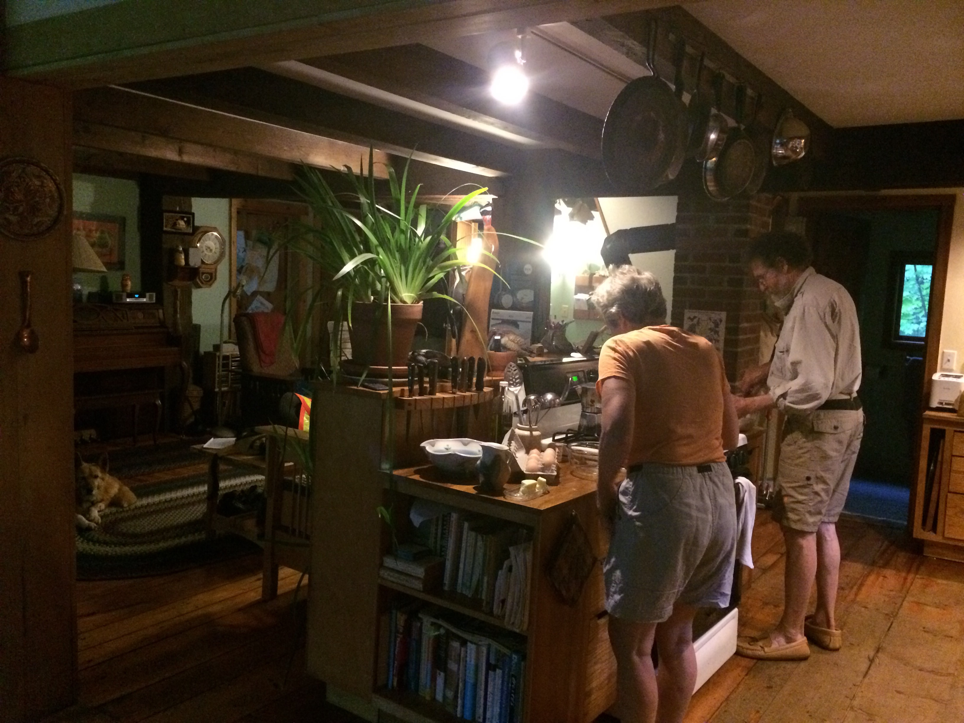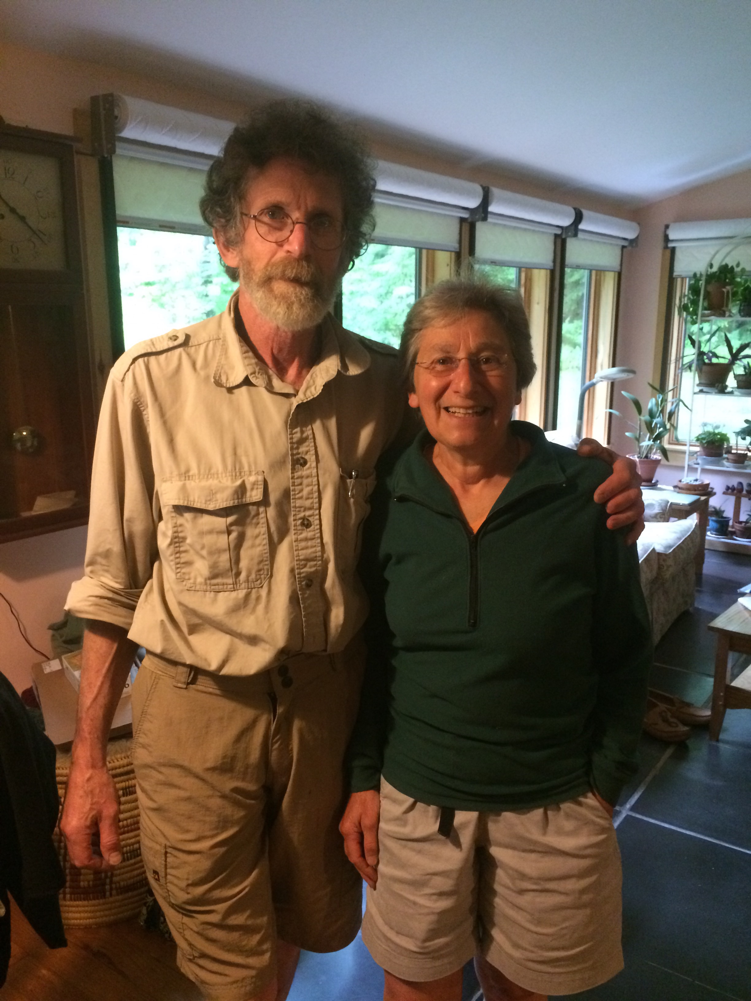 Last night, our hosts Ellen and Steve, both doctors, prepared for Jeffrey a fish caught by their son, pasta with pesto made from their garden, lettuce that grew on its own from last year’s seed, and other good things. This morning they fed him eggs, cheese, and Maine-style pancakes drenched with their homemade maple syrup and peach jam. Ellen did Jeffrey’s laundry (being a kangaroo puppet, I had none myself) and both our hosts spent a lot of time considering routes for the next leg of our journey. All this a day after Ellen and Steve returned from a 100-mile self-contained canoe trip! Real Mainers after 33 years here, they don’t think that is impressive. But we do! Ellen told how her refugee father reached America from Poland via France and Mexico, settling in North Creek, NY, where she grew up. Before we left this morning, she donated to Human Rights First.